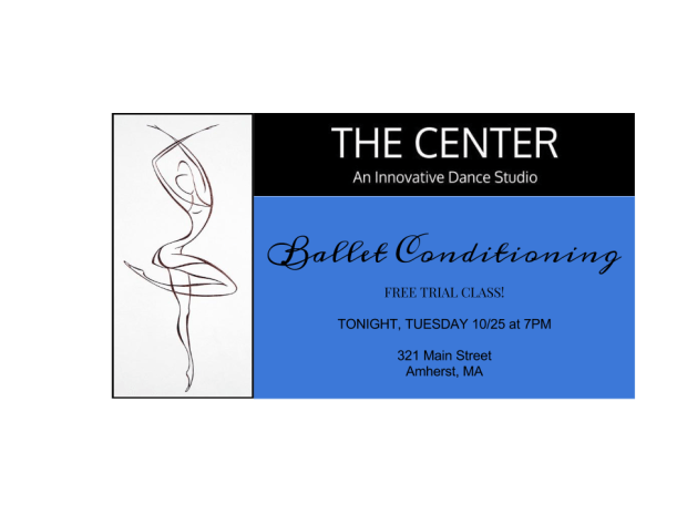 Tuesday, 10/25 at 7PM: Ballet Conditioning (1 hour): A ballet workout designed to develop core strength, lengthen muscles, improve posture and increase stamina. Barre exercises provide a meditative strengthening and toning routine, while center work offers an opportunity for low-impact, fun cardio dance.