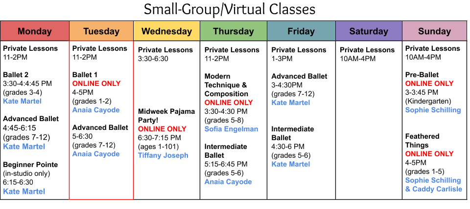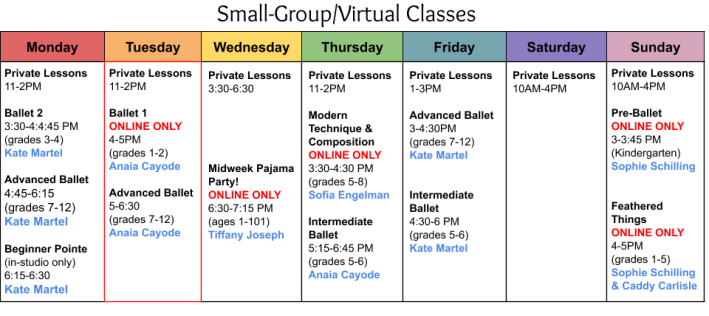 The Center Dance is ELATED to offer a full program of classes, specially crafted to meet a broad range of needs and preferences. Visit our K-12 and Toddler/PreK class descriptions for information on Outdoor, Virtual and Small-Group In-Studio classes.*
