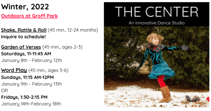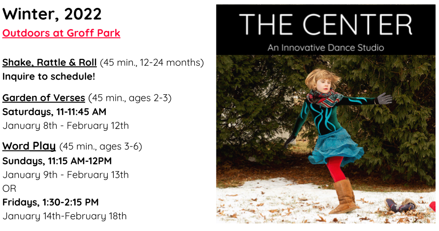 The Center Dance will hold a full lineup of outdoor Pre-K classes this winter, at Groff Park in South Amherst. Designed for children ages 2-6, The Center’s unique curriculum promotes creativity, connection, literacy and play!
