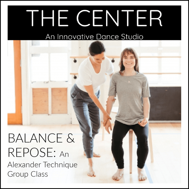 Balance and Repose: an Alexander Technique Group Class (1 hour): Repose can be powerful. In this morning movement class, students will focus on ease, awareness, and balance using the principles of the Alexander Technique. Class will uncover habitual patterns and clear the way for more freedom, creativity, and poise. Movement structures will draw from modes such as dance, yoga, Bartenieff Fundamentals (developmental movement patterning), and more. With conscious care, students will engage with their world with less stress and greater overall function.