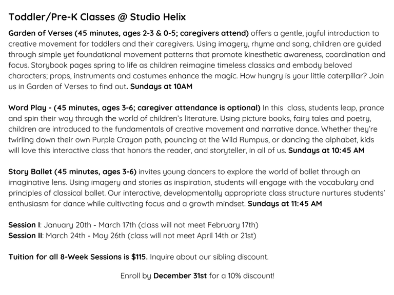 Word Play (45 minutes, ages 3-6) In this 45 minute class, students leap, prance and spin their way through the world of children’s literature. Using picture books, fairy tales and poetry, children are introduced to the fundamentals of creative movement and narrative dance. Whether they’re twirling down their own Purple Crayon path, pouncing at the Wild Rumpus, or dancing the alphabet, kids will love this interactive class that honors the reader, and storyteller, in all of us.