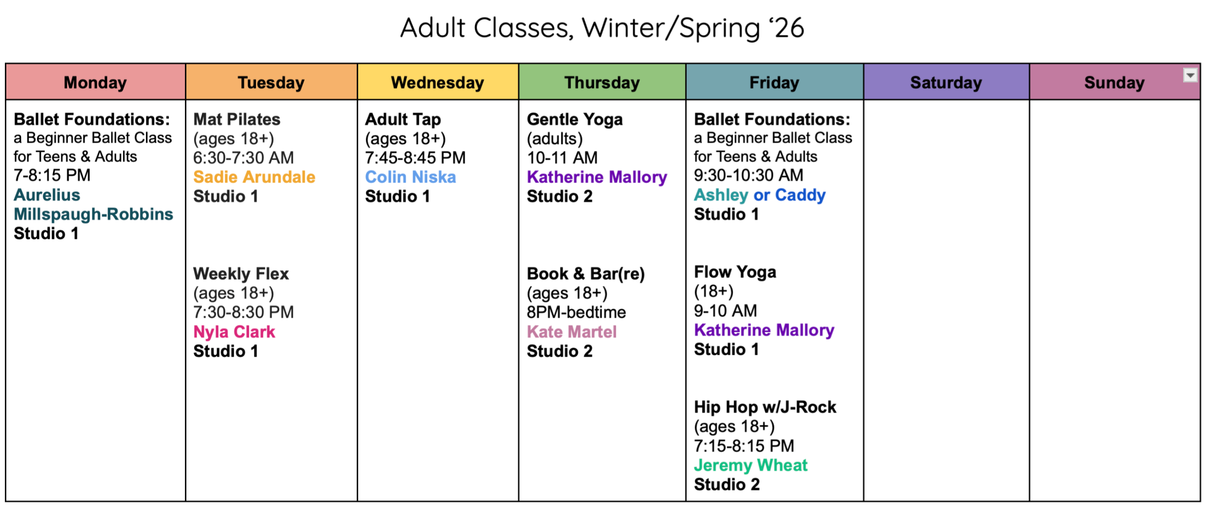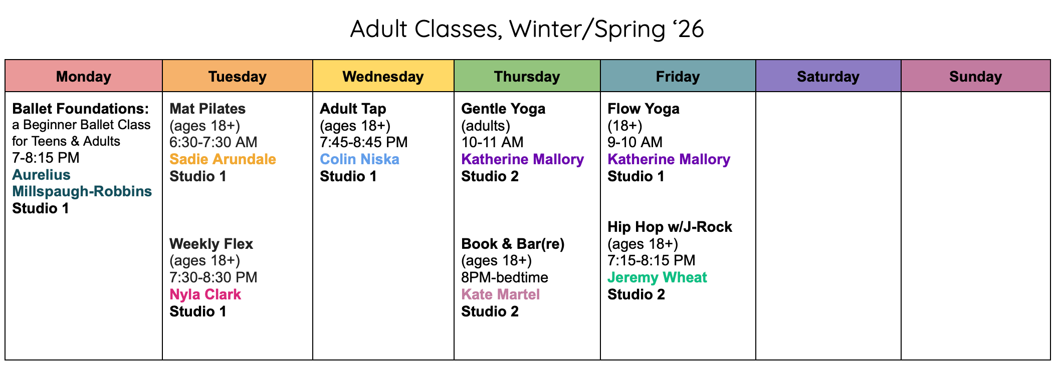 All adult classes EXCEPT for Book & Bar(re) will run in 6-week sessions this winter and spring.